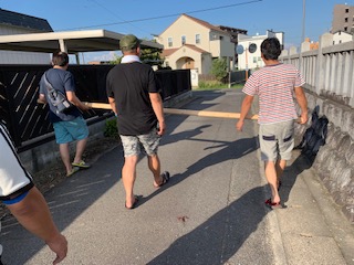 実際に担ぎ棒を持って経路を通り、道幅、障害物などの確認をします。