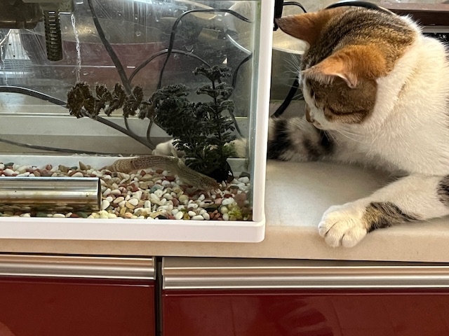 どうしても水槽の中のドジョウを捕まえたいらしい・・・