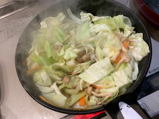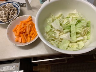 キャベツ、人参、玉ねぎ、しめじを刻んで