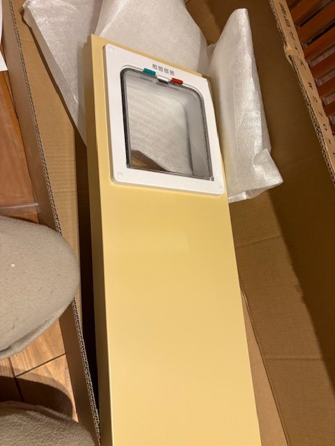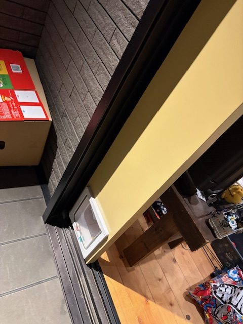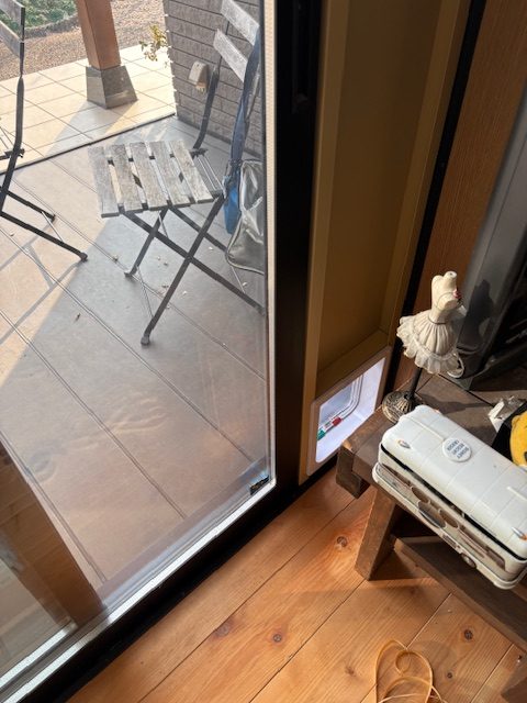 サッシにはめ込み、このプラスチックの小窓から外に出られる仕組み
