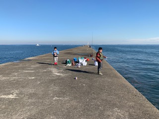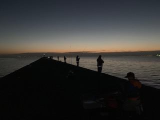 真っ暗の中、横一列に並んで一斉に釣り糸を投げます。