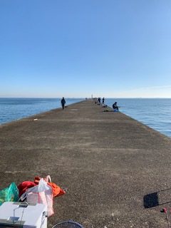 夜が明けると絶景!  果てしなく続く堤防の遥かかなたに灯台が見えますね。