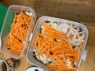 配合した酢に漬け、みじん切りしたニンジン、タマネギをのせます。