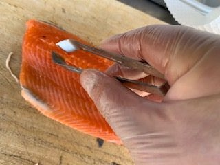 ピンセットで中骨を取り除き(この鮮やかなオレンジ色・・刺身でもいけそうな)