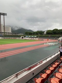 一時中断するほどの雨なので、屋根付きのスタンドから応援しようと思いましたが、