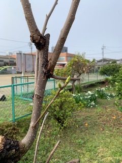もう枯れてしまったかと思っていた畑の柿の木から新芽が